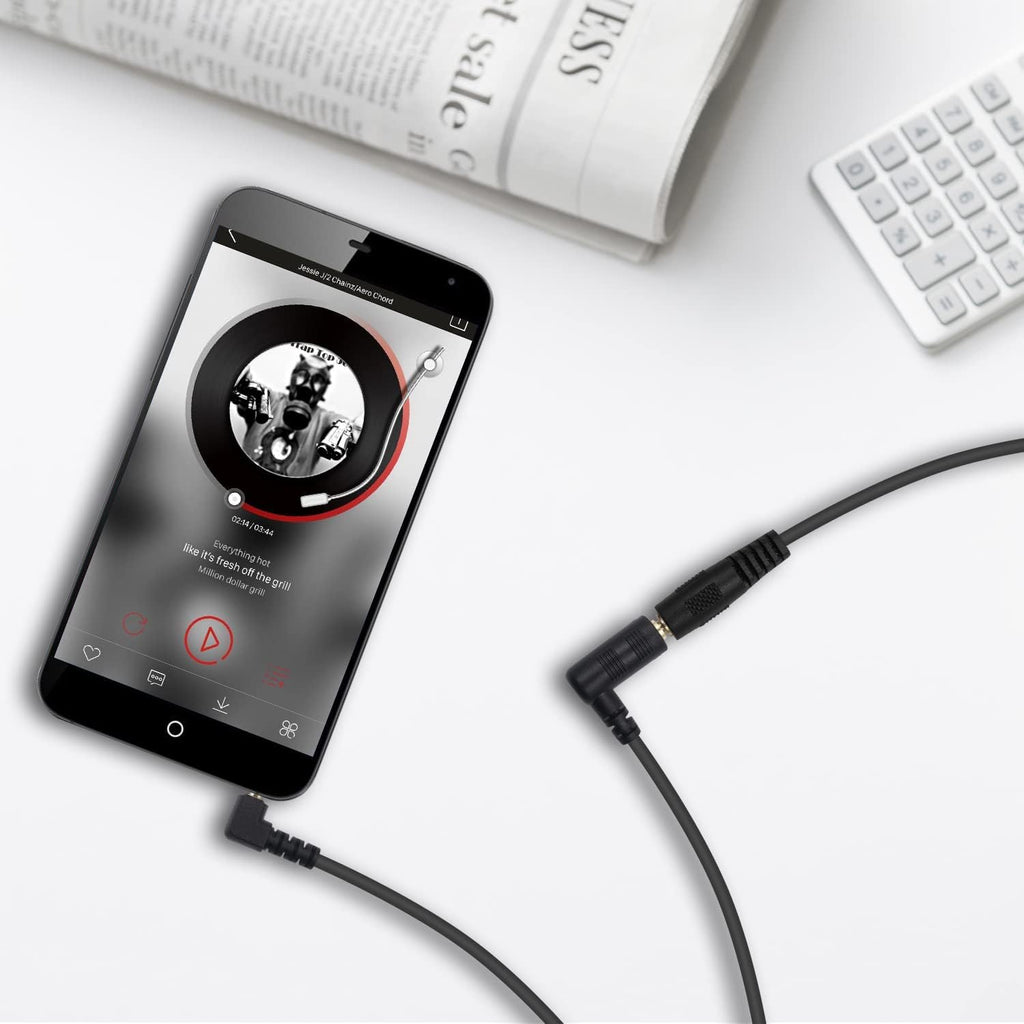 The right-angle male connector allows easy connection in tight or awkward spaces, helping to reduce strain on the cable and device audio port. This makes it suitable for use with car dashboards, portable audio players, laptops, PCs, TVs, and audio systems.