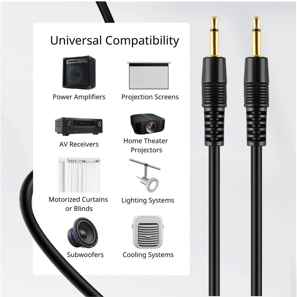Works with gear that features 3.5mm 12V trigger in/out ports, amplifiers, pre-amps, A/V receivers, projectors, motorised projector screens, IR receivers/senders, DACs, and disc players. Common wiring is TS (Tip = +12V, Sleeve = Ground); check your device manual for polarity and voltage.