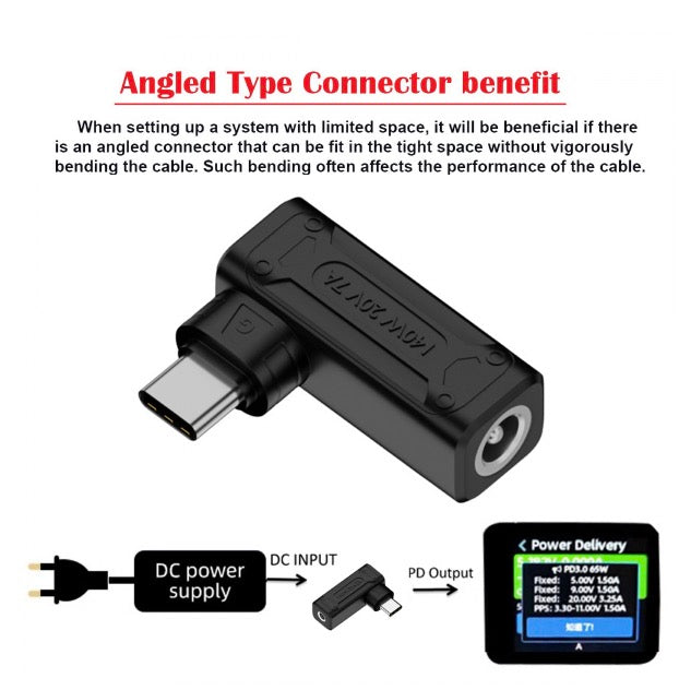 This 5.5 x 2.1mm DC Input to USB C angled male PD charging adapter allows you to convert a compatible DC barrel power source into a USB-C Power Delivery output. It provides a practical solution for powering USB-C laptops, tablets and other PD-enabled devices using supported high-wattage DC chargers.