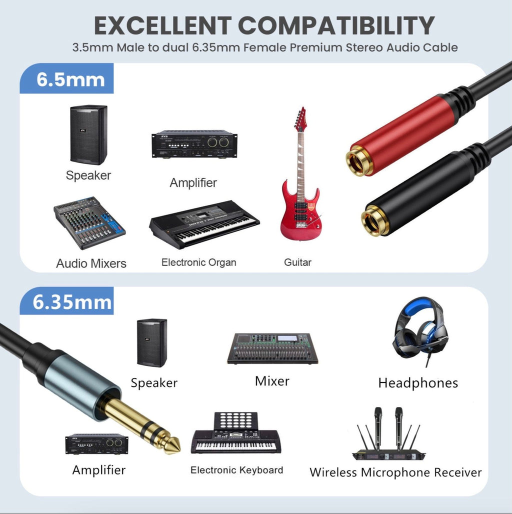 6.35mm (1/4 Inch) Jack Y Splitter Cable – TRS Stereo Male to Dual 6.35mm Female Audio Adapter