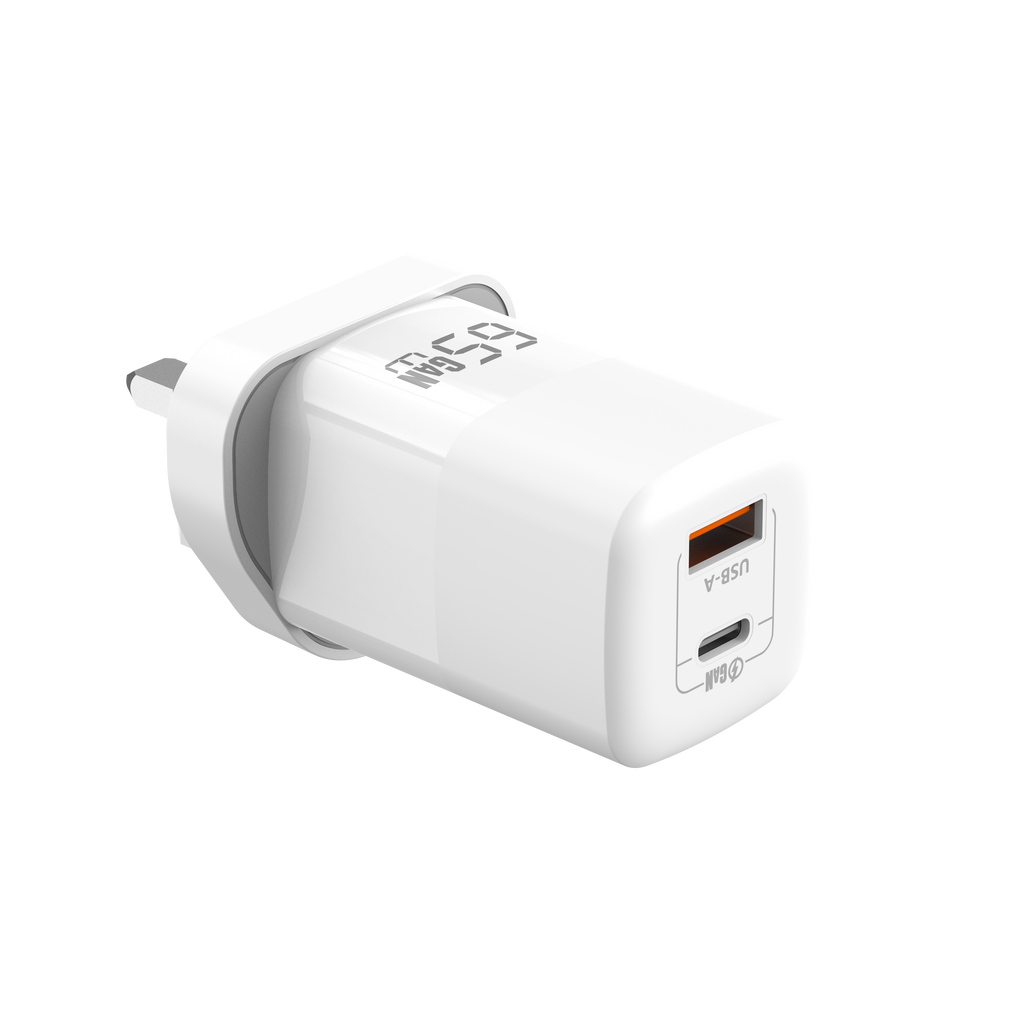 Power your devices efficiently with this 65W PD USB-C Charging Plug, designed to deliver fast, reliable charging through both USB-C and USB-A outputs. With a powerful 65W maximum output, this compact wall charger is ideal for charging laptops, tablets, smartphones, and accessories from a single UK mains socket.
