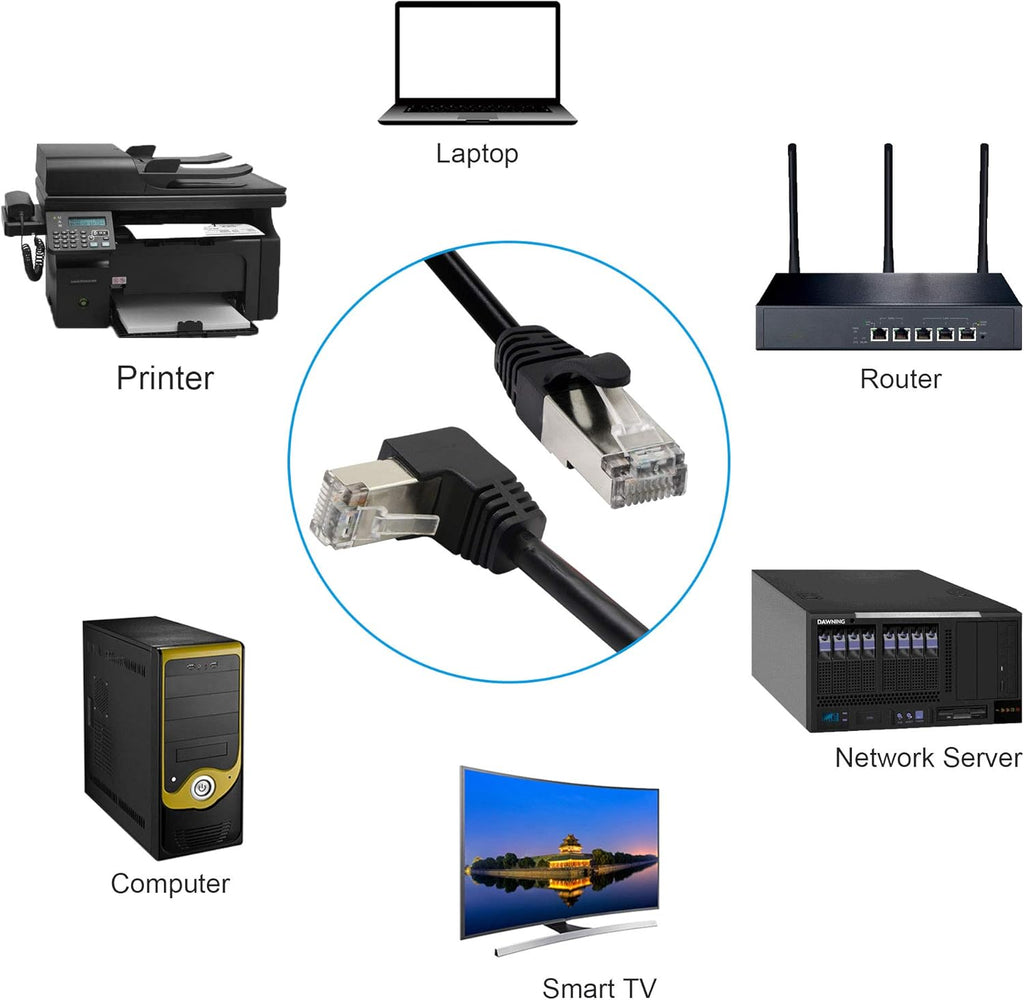 The integrated 90-degree up-angled RJ45 connector provides a practical space-saving solution for installations where clearance is limited. This angled design reduces strain on ports and cables when connecting to routers, switches, wall sockets, patch panels, or network devices positioned close to walls or inside cabinets, helping to extend both cable and equipment lifespan.