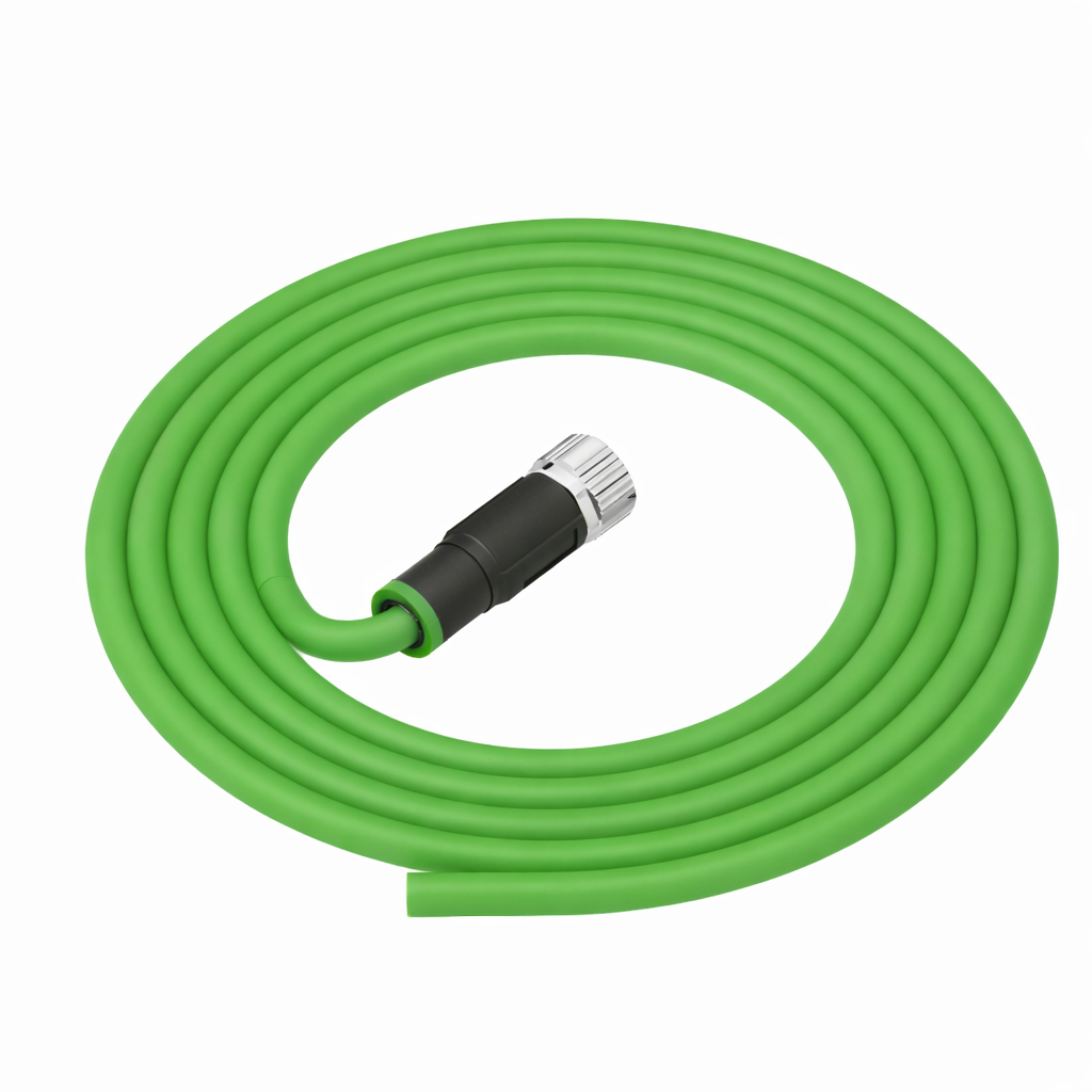 The overmoulded M12 connector provides IP67 ingress protection against dust and temporary water immersion, ensuring dependable operation in harsh conditions. Manufactured with a halogen-free PUR outer jacket, this cable is suitable for drag chain and torsional stress applications, offering resistance to oil, abrasion and continuous flexing.
