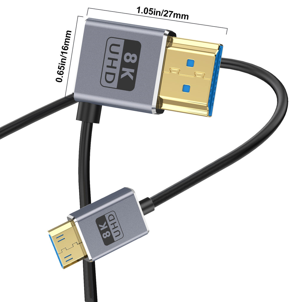 This Mini HDMI to HDMI 2.1 coaxial extreme slim cable (left-angled) is engineered for ultra-high-bandwidth video transmission in compact or space-restricted installations. Featuring a Mini HDMI male connector to HDMI 2.1 male connector with a left-angled design, it reduces cable strain and allows for a cleaner connection behind cameras, monitors, laptops, and other devices where straight connectors are impractical.