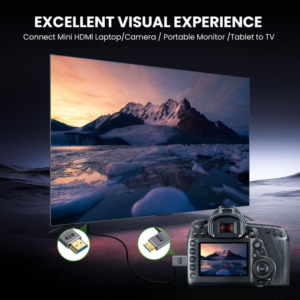 Ideal for cameras, camcorders, laptops, tablets, graphics cards, and portable displays, this left-angled Mini HDMI to HDMI 2.1 cable is a reliable solution for professional video capture, content creation, gaming, and home cinema setups where both performance and space efficiency matter.