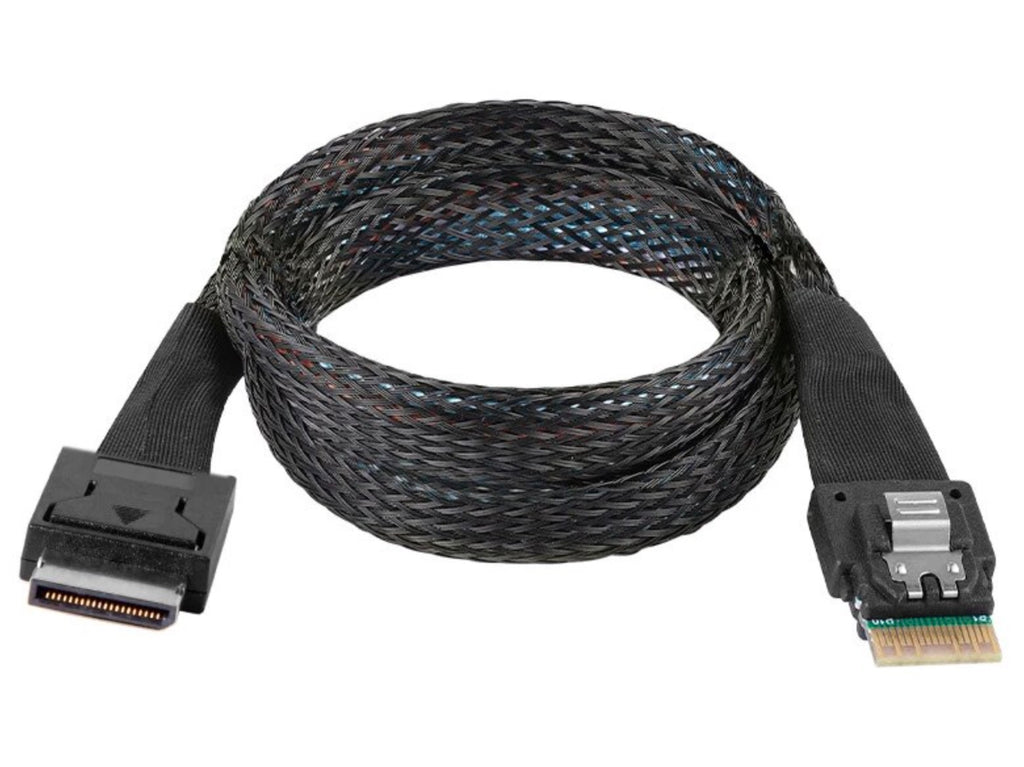 This cable connects an OcuLink SFF-8611 interface to a Slimline SAS SFF-8654 interface, commonly used in enterprise storage systems, servers and high-performance computing environments.