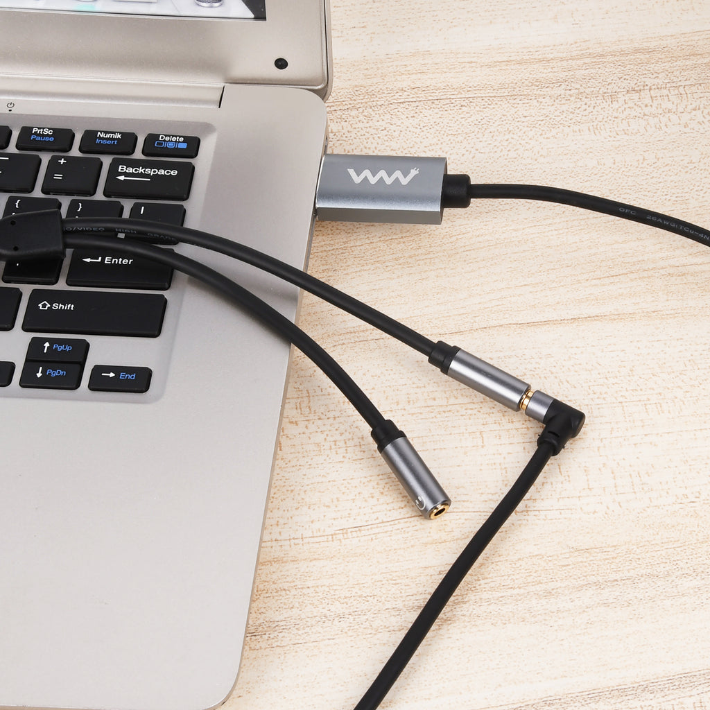 • USB-A male to dual 3.5mm female audio + microphone adapter